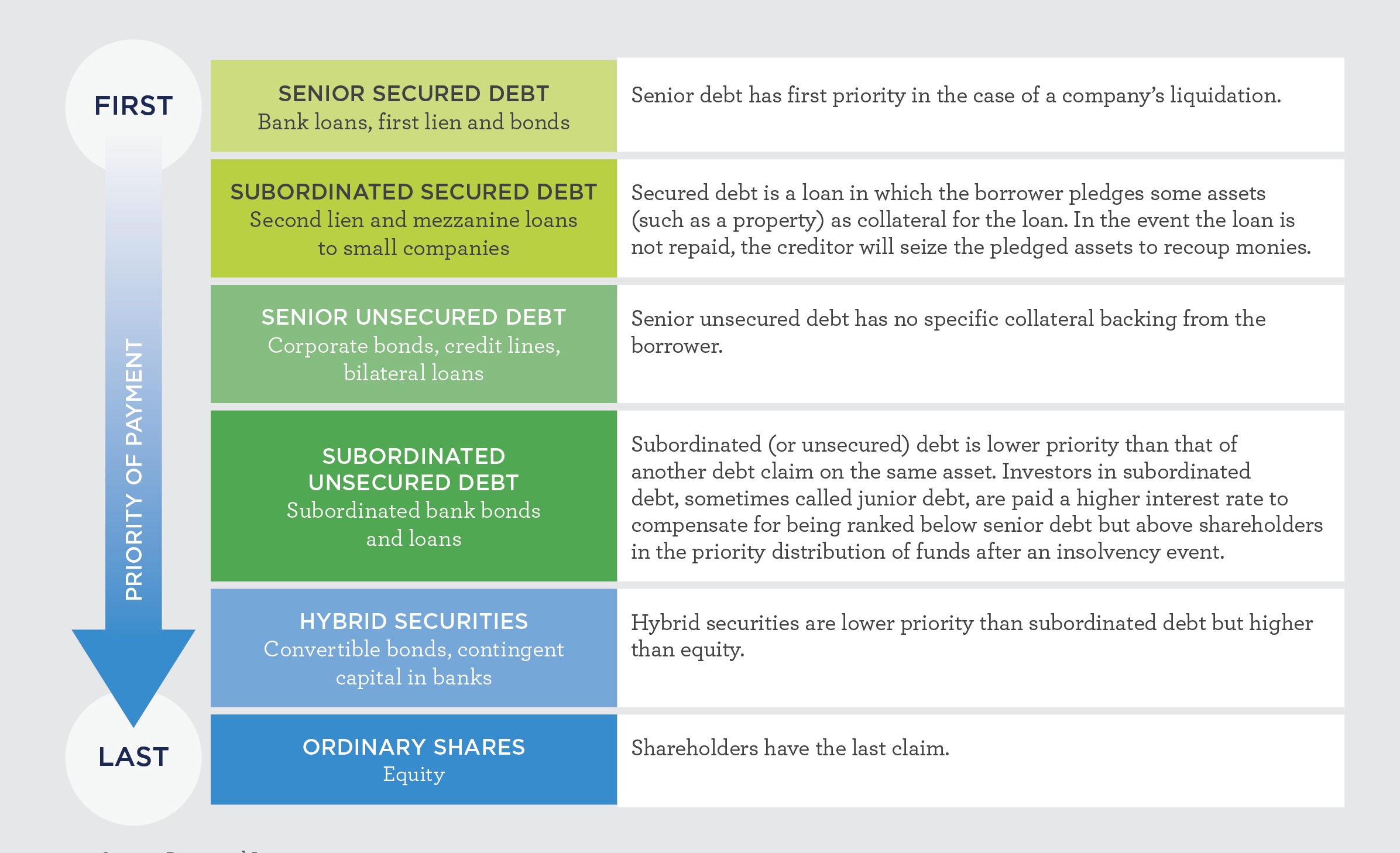 When investing in fixed income securities, it’s important to consider the capital ranking of each security; this indicates the price stability of each. Figure two illustrates how investors in debt assets fare in the event of a company being wound up. Investors in fixed income assets, such as secured or unsecured debt, typically rank higher in priority and should have their invested capital returned to them before capital is returned to investors in hybrid securities or shares.