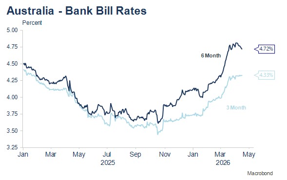 Short-term interest rates and longer-term bond yields were relatively quiet over the week, before dropping sharply on Friday on news of the reopening of the Strait of Hormuz. Some rebound is likely early on Monday given weekend developments. US markets continue to price some mild risk of a further US rate cut, though a full rate reduction is not priced until July 2027. Meanwhile, Australian shorter-term yields further discounted a third successive interest rate rise by the RBA, this now being 77% priced for May and 99% priced by June. I continue to think a June move is more likely.